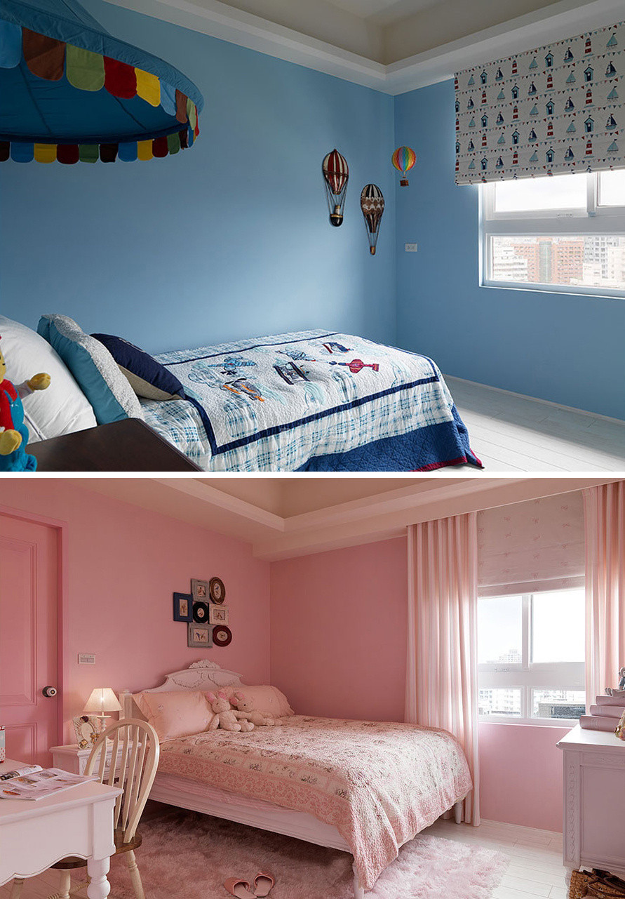 整體天空藍的男孩房,夢幻般的女孩房。