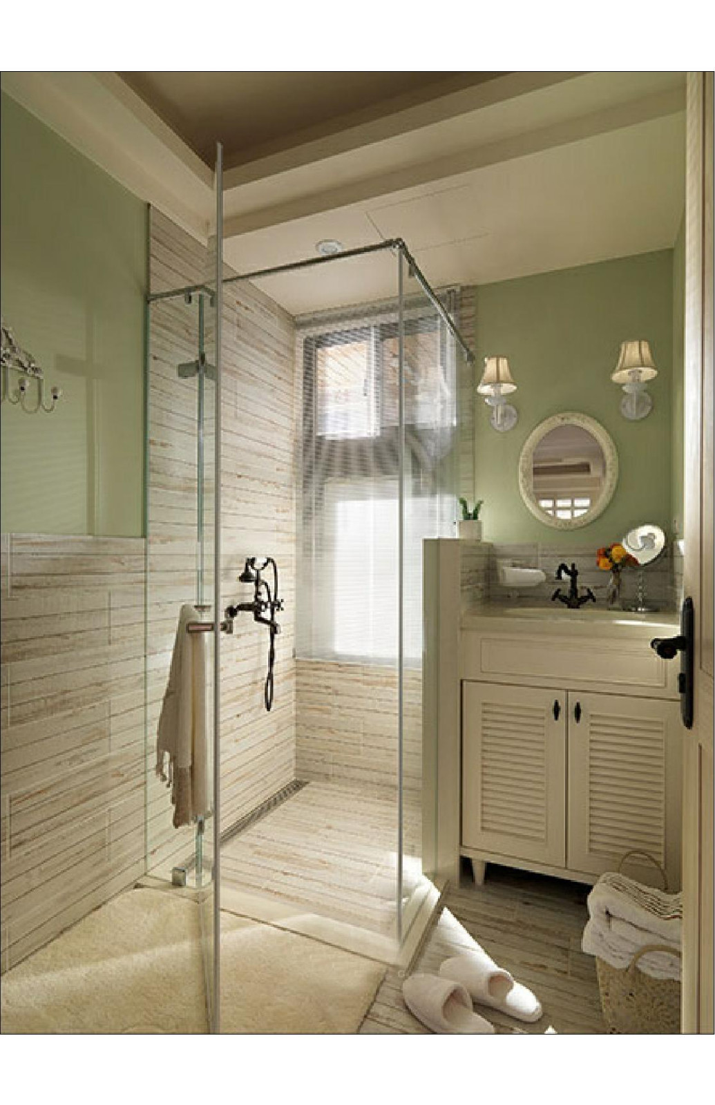 衛(wèi)生間同樣為暖色系,淋浴房地漏的設計使得在使用時腳下不會積水。