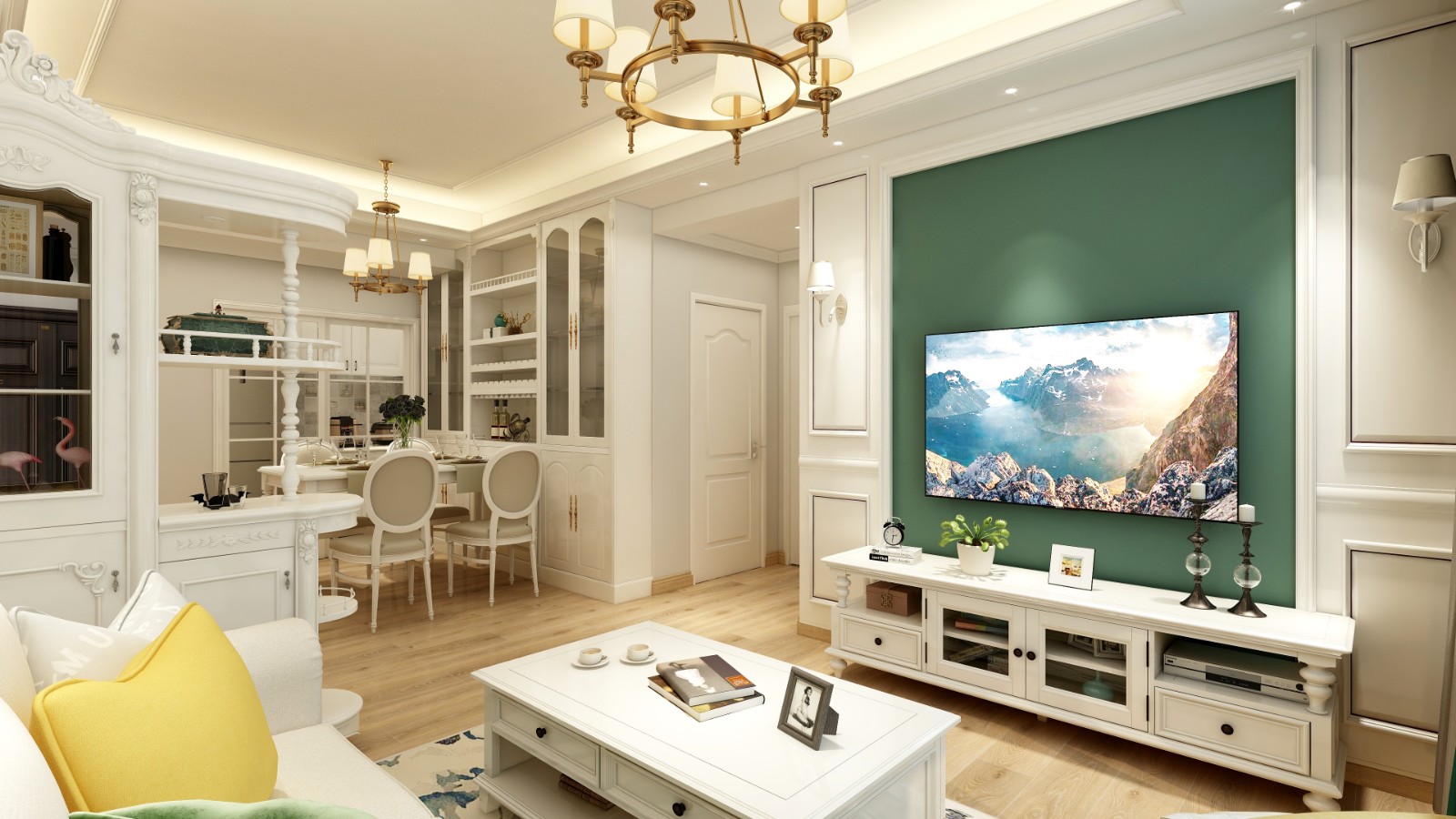主臥背景墻延續(xù)電視背景墻的墨綠色調(diào),寧?kù)o、閑適、內(nèi)斂,將兩幅黃色系裝飾畫(huà)引入空間,增添一絲活躍氣息。