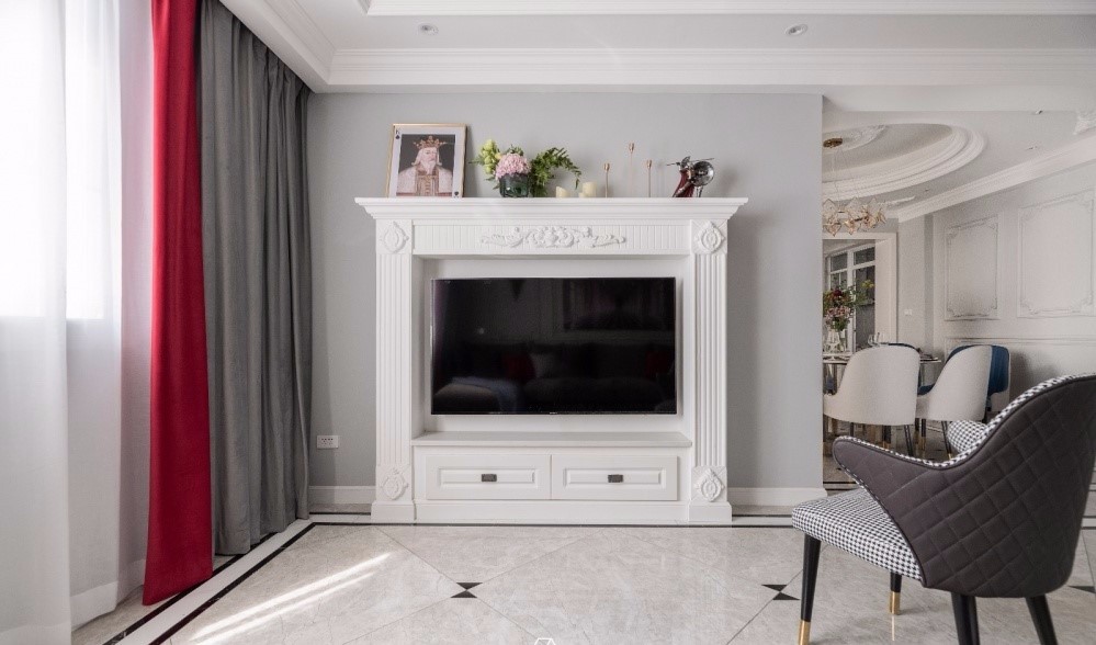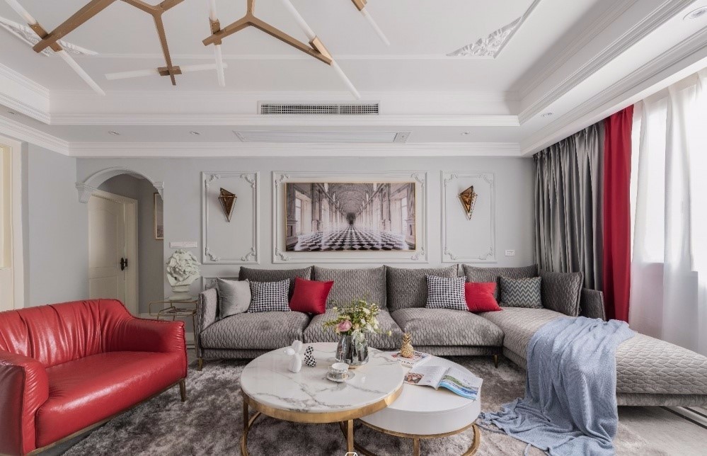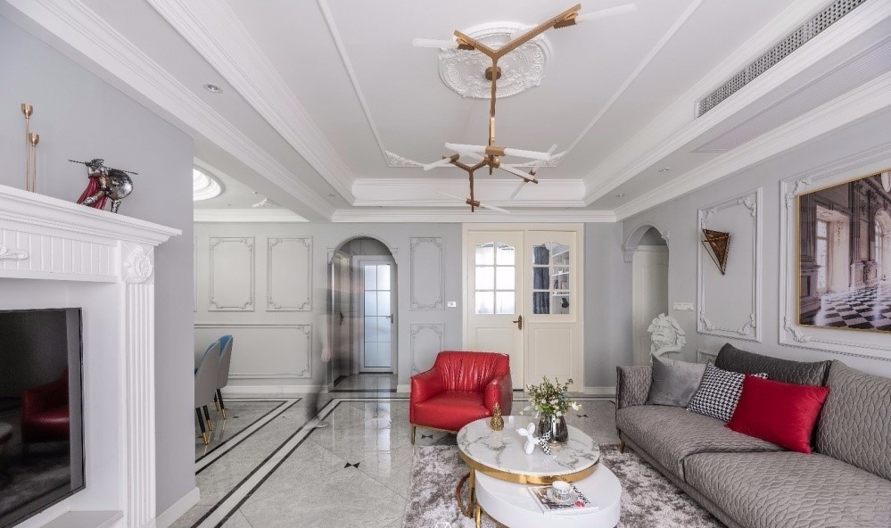 利用極具“庸俗”和“浮夸”的歐式石膏雕花和線條與高級(jí)灰的墻面碰撞。